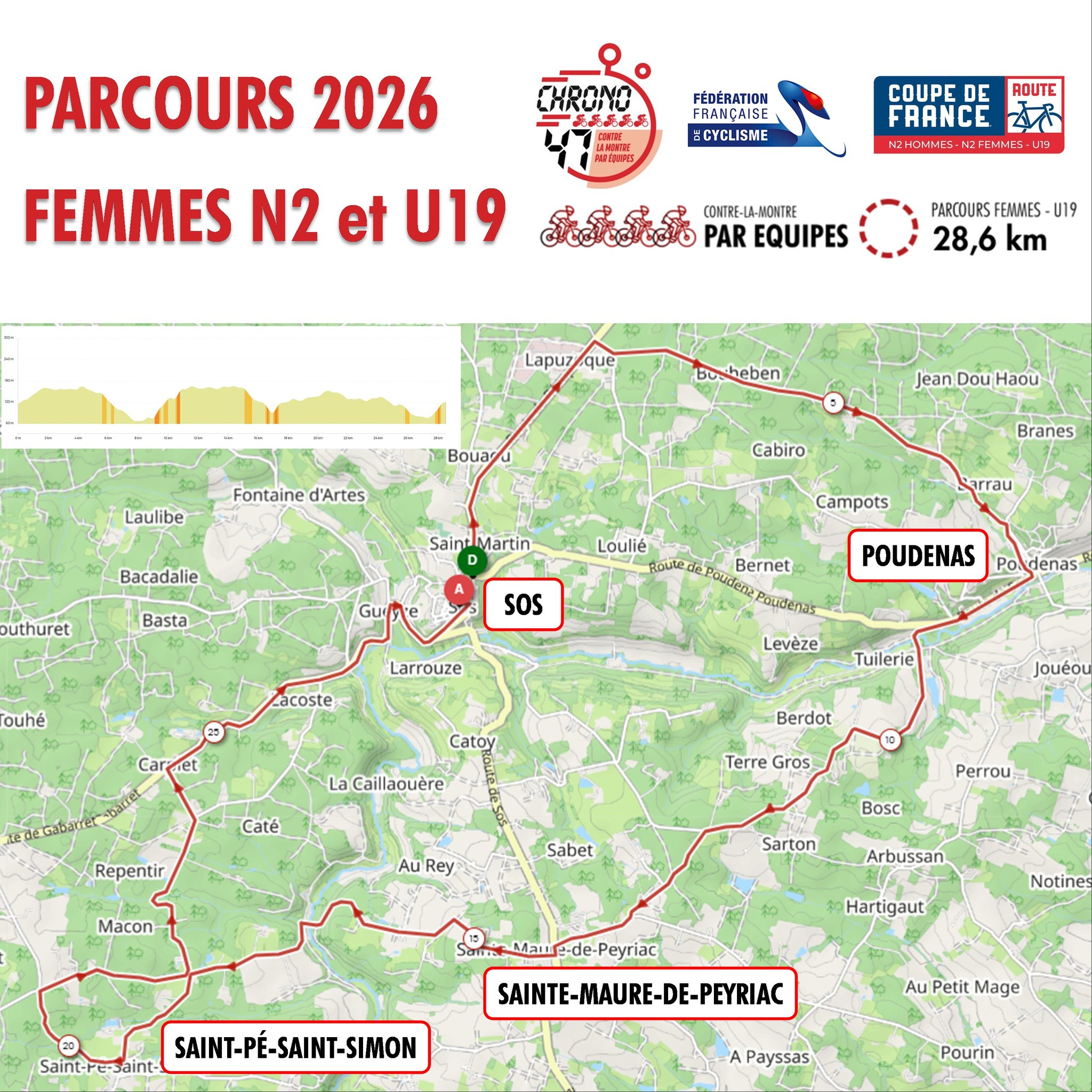 Après Mézin, Feugarolles, Lamontjoie, Vianne, Sos, Francescas et Bruch, c'est au (re)tour de Sos d'être la ville hôte du Chrono 47. La commune est de nouveau prête à relever le défi et faire de ce rendez-vous annuel en Albret une nouvelle grande fête du cyclisme, le 1er mai 2026.