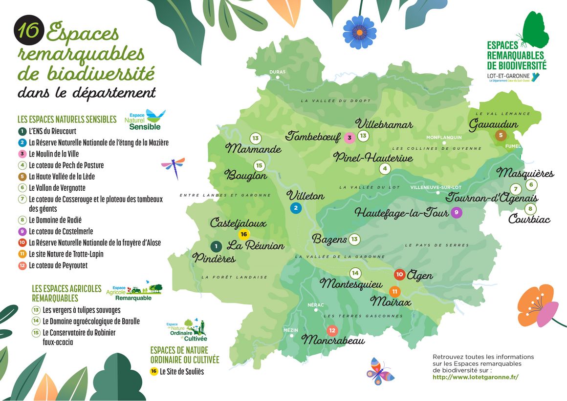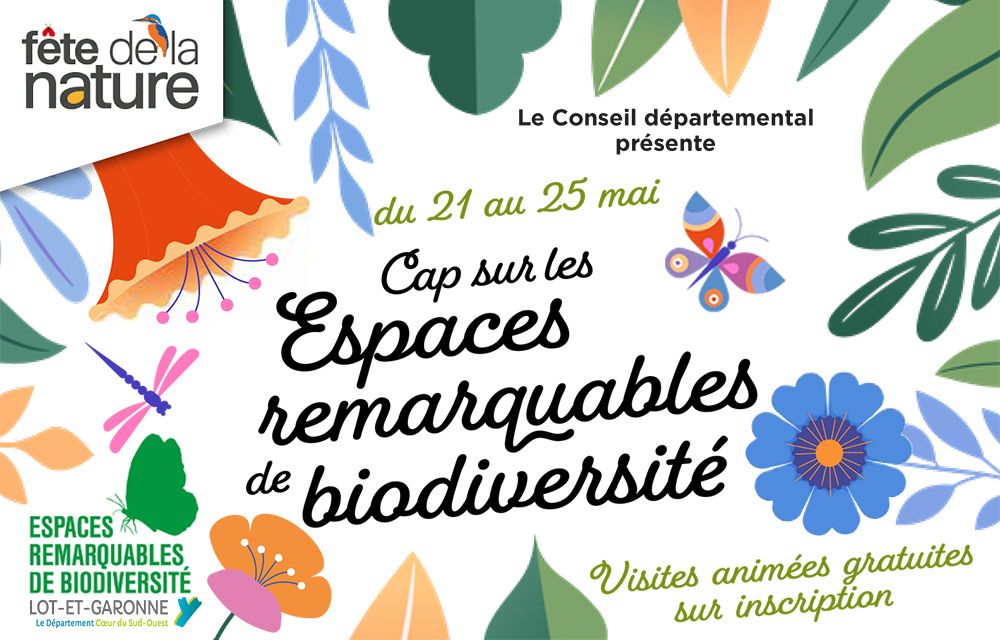 Dans ce cadre, le Département de Lot-et-Garonne vous invite à explorer les sites qu’il a labellisés "Espaces Remarquables de Biodiversité". En partenariat avec les associations naturalistes gestionnaires de ces sites, un programme d'animations (pdf - 11,99 mo) vous permettra de découvrir des lieux naturels que vous ne connaissez peut-être pas encore, ainsi que les richesses insoupçonnées de la faune et de la flore locales.