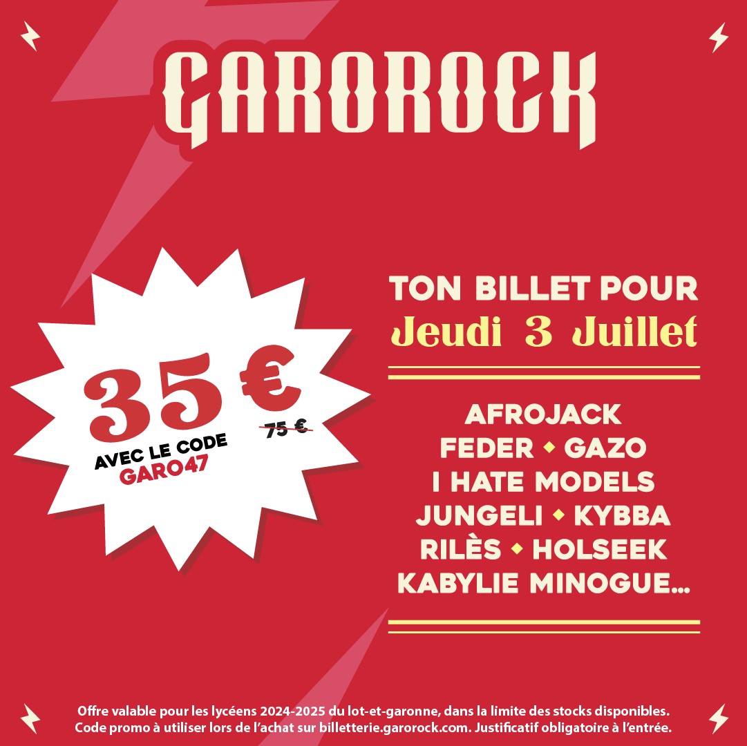 Pour fêter le début des vacances, Garorock vous régale avec une journée de festival à prix mini : 35 € au lieu de 75 € sur le jeudi 3 juillet, grâce au code promo GARO47, réservé aux Lot-et-Garonnais entre 16 et 18 ans. Au line-up ce jour-là : Gazo, Rilès, Feder, I Hate Models, Afrojack et plein d’autres… Commence ton été avec des concerts non-stop, des animations de folie et une ambiance unique à Garorock ! Attention, cette offre exclusive est valable dans la limite des places disponibles. Alors ne traîne pas, réserve ta place et commence les vacances en beauté !