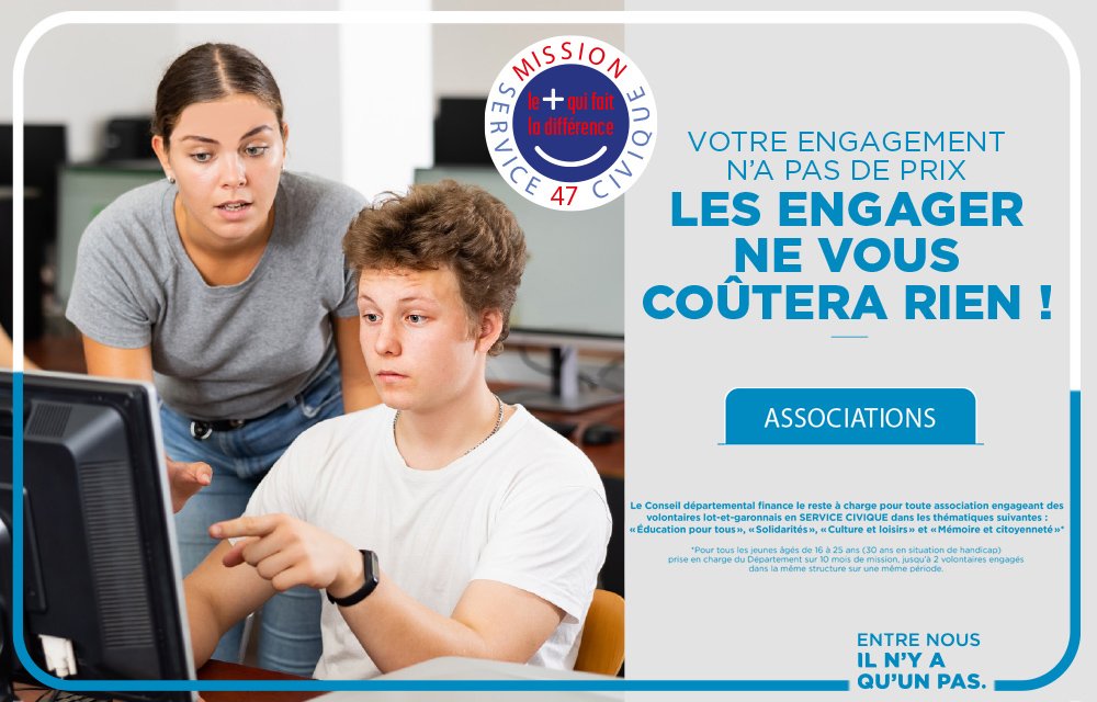Le Conseil départemental finance le reste à charge pour toute association engageant des volontaires lot-et-garonnais en SERVICE CIVIQUE dans le cadre des thématiques prioritaires « Education pour tous », « Solidarité », « Culture et loisirs » et « Mémoire et citoyenneté »*.