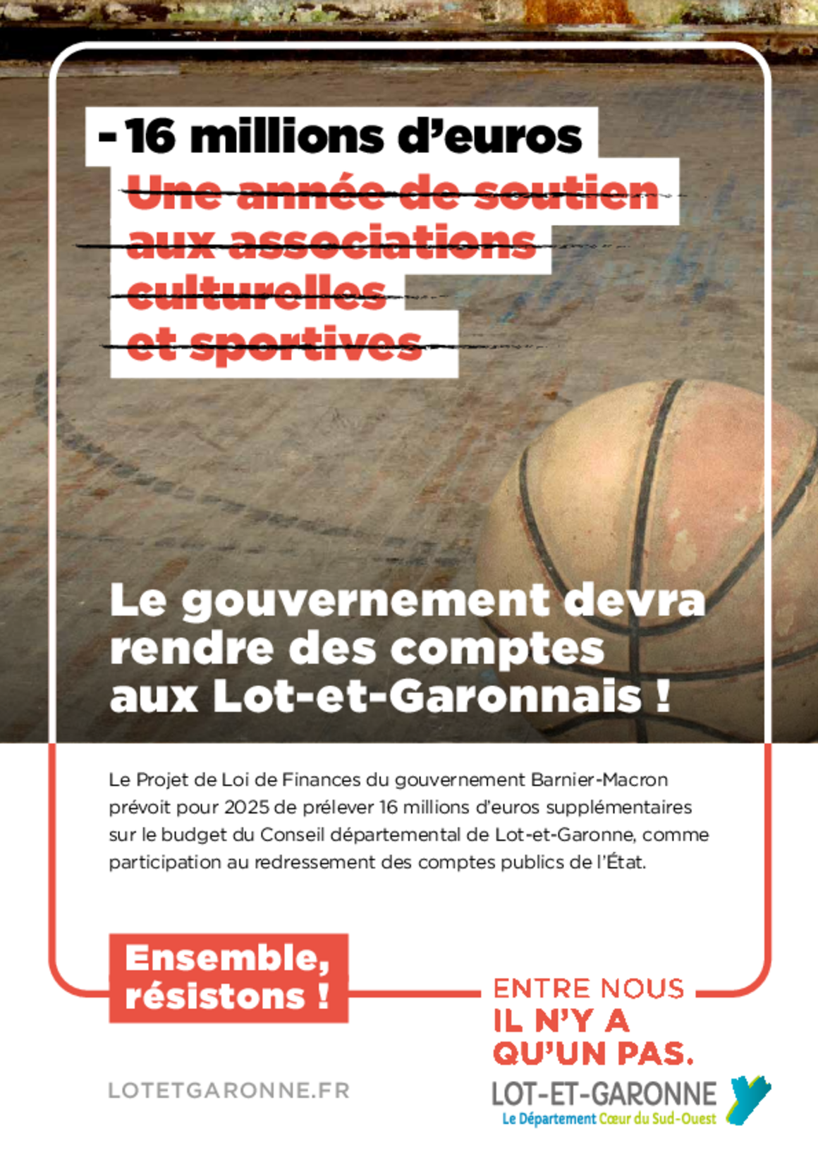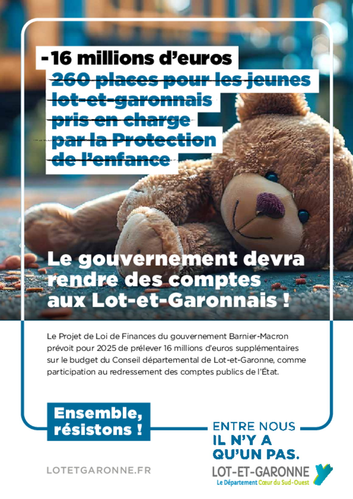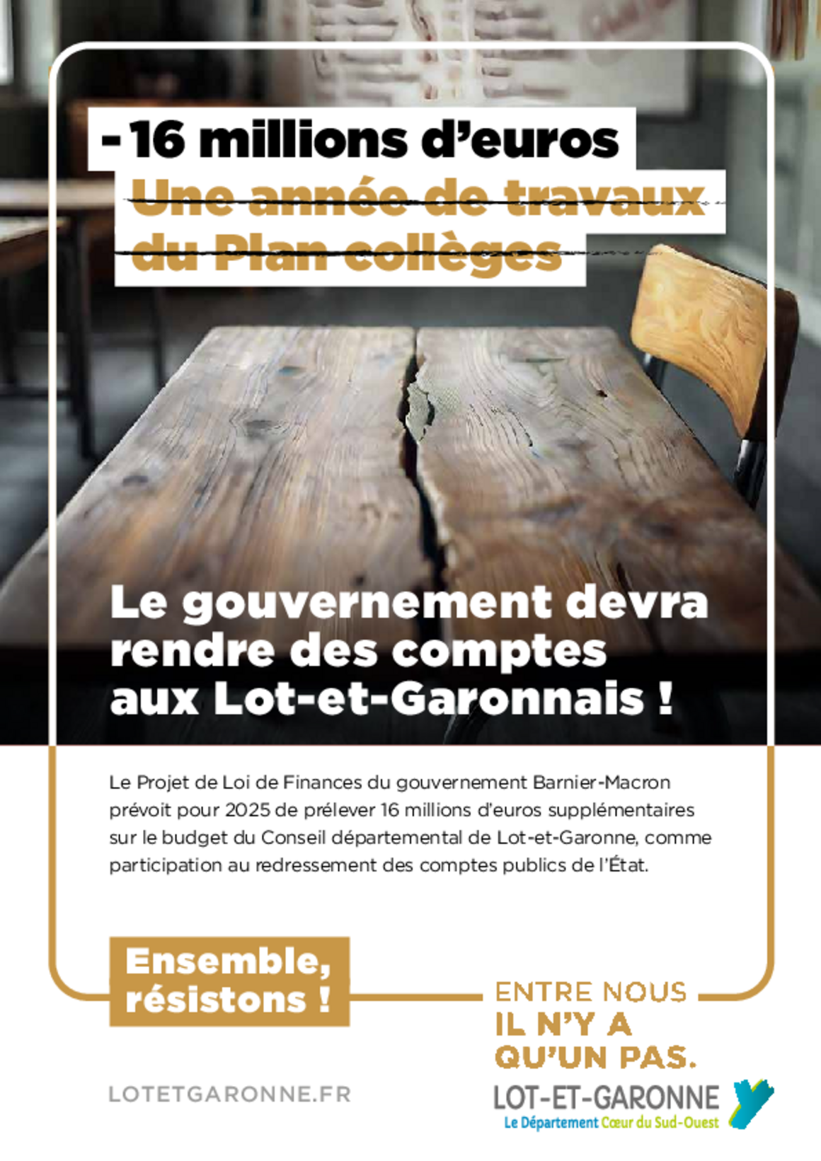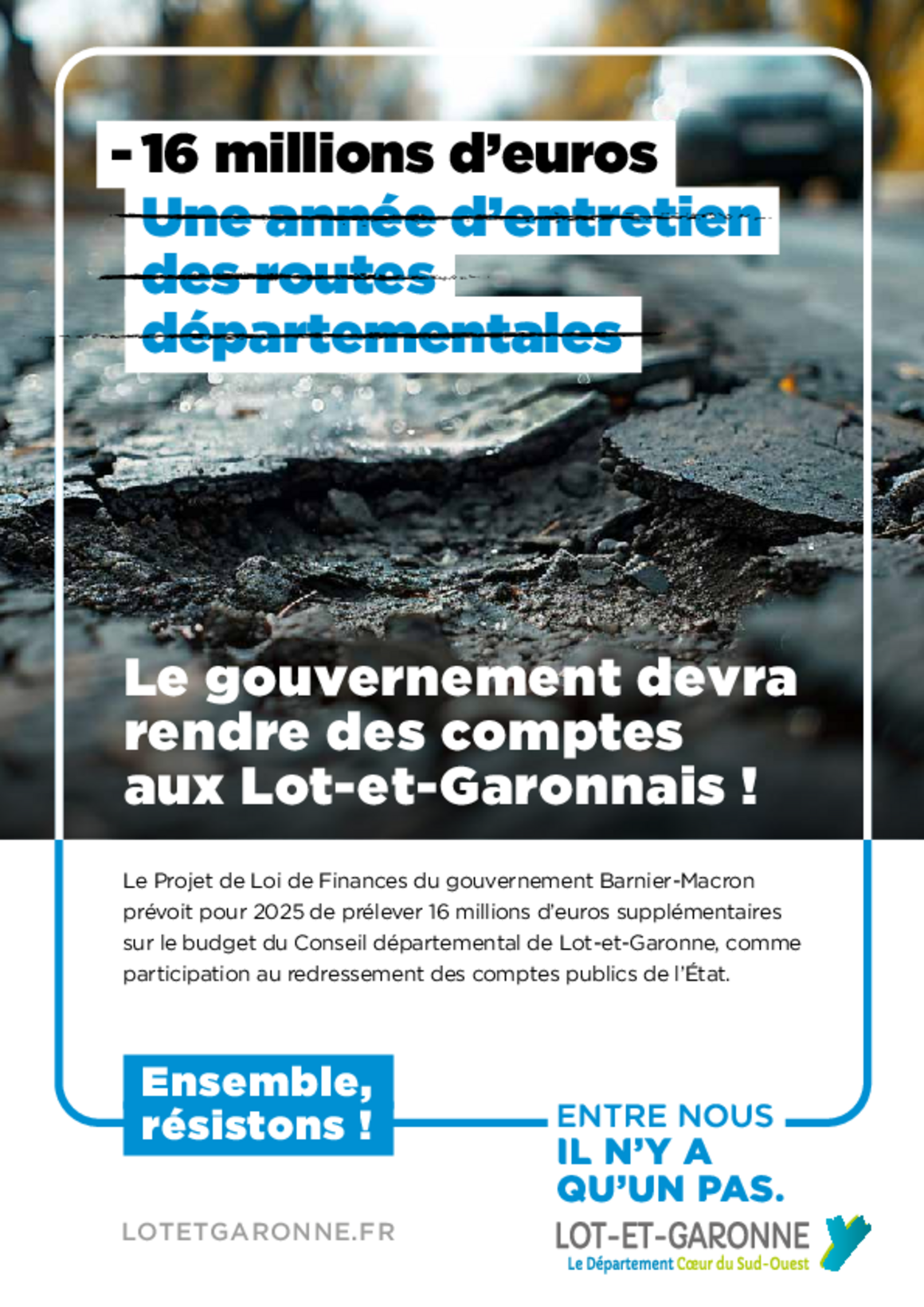 16 M€ de ponction supplémentaire prévue par le Projet de Loi de Finances 2025, c'est la goutte d'eau qui fait déborder le vase. Le Gouvernement devra rendre des comptes aux Lot-et-Garonnais !