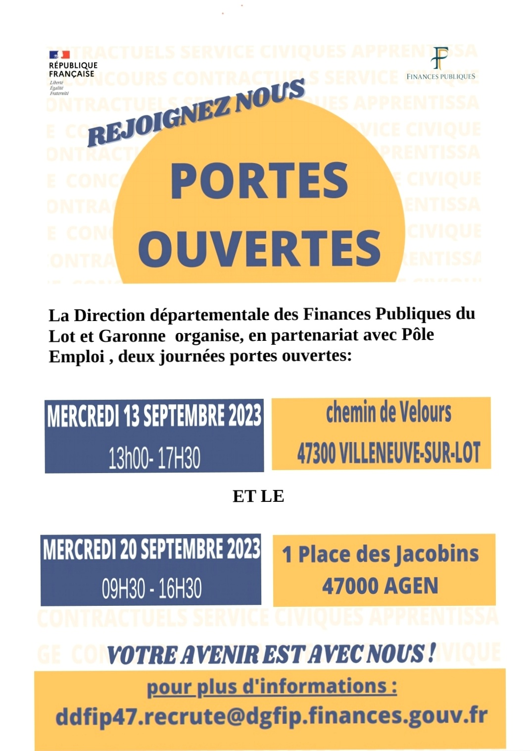 Pour plus d'informations rendez-vous sur : ddfip47.recrute@dgfip.finances.gouv.fr