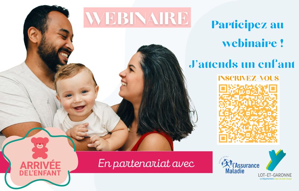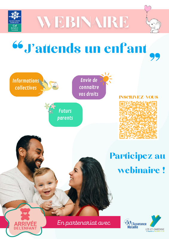 Le prochain webinaire "J'attends un enfant" co-animé par la Caf, la CPAM et la PMI (Protection maternelle Infantile) aura lieu lundi 23 mars 2026 à partir de 17h15.