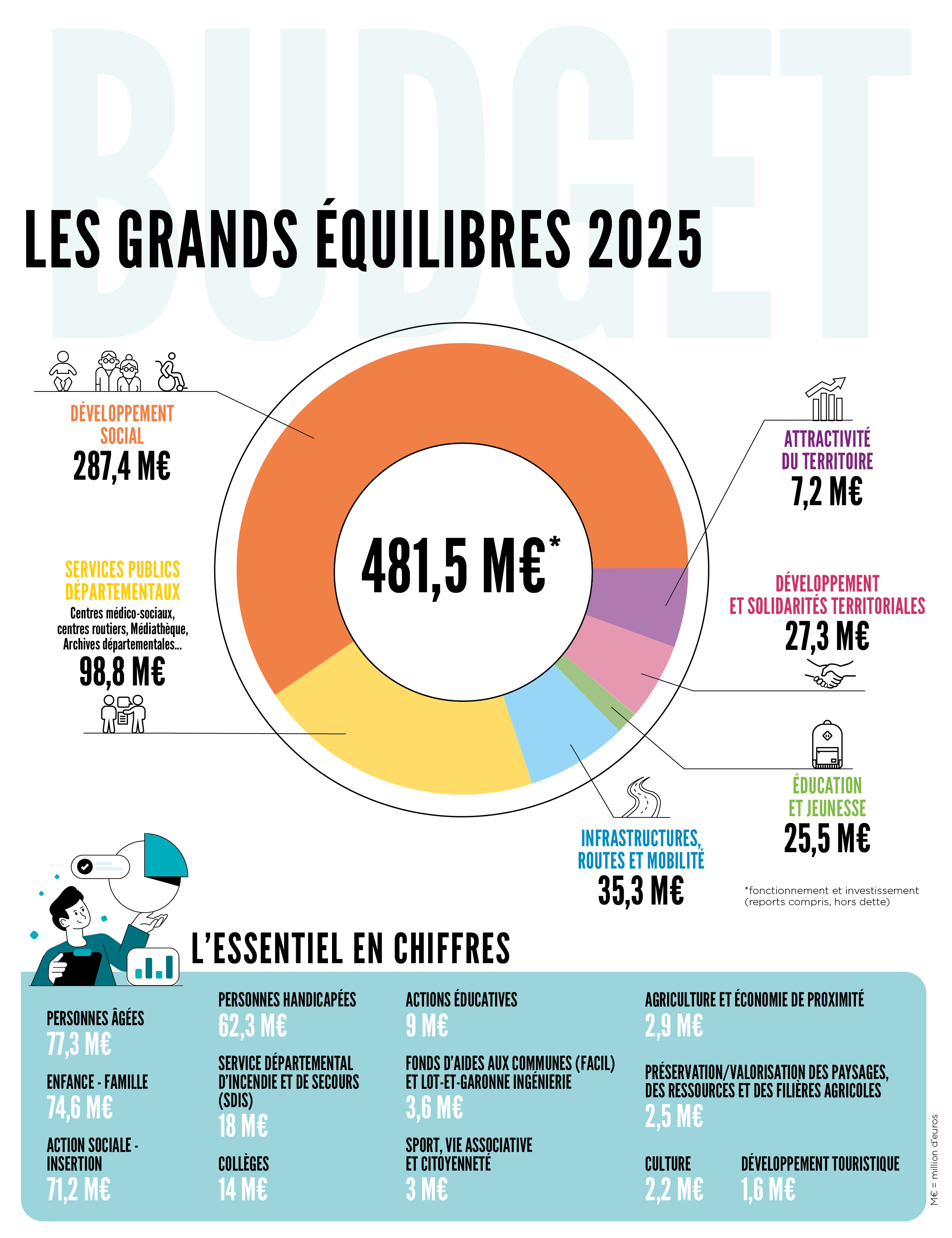 Aussi pour 2025, le budget primitif du Conseil départemental de Lot-et-Garonne s’équilibre à 481,5 millions d’euros (reports inclus, hors dette) :