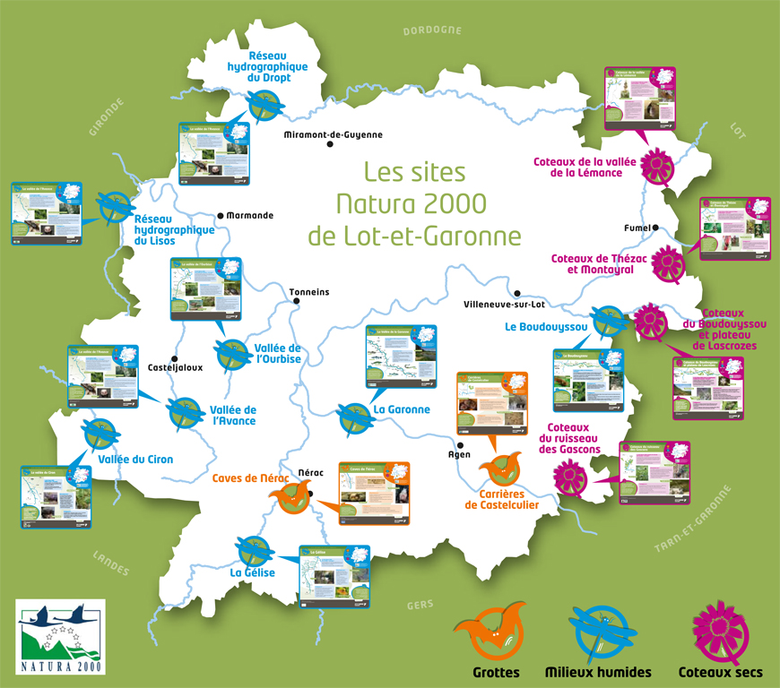Conscient que Natura 2000 est un outil de développement durable des territoires ruraux, le Département a choisi de valoriser et faire connaître ce patrimoine naturel particulier en créant, dès l’été 2013, des panneaux d’information disposés sur les communes concernées par ces sites. En Lot-et-Garonne, 14 sites ont été désignés « sites Natura 2000 » répartis sur 121 communes.
